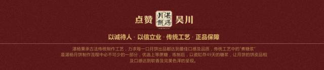 使用明末广为流传下来的工艺制作,经二十余道工序,保证了月饼的现代味道,色泽纯正自然,馅料饱满充足,醇香可口。