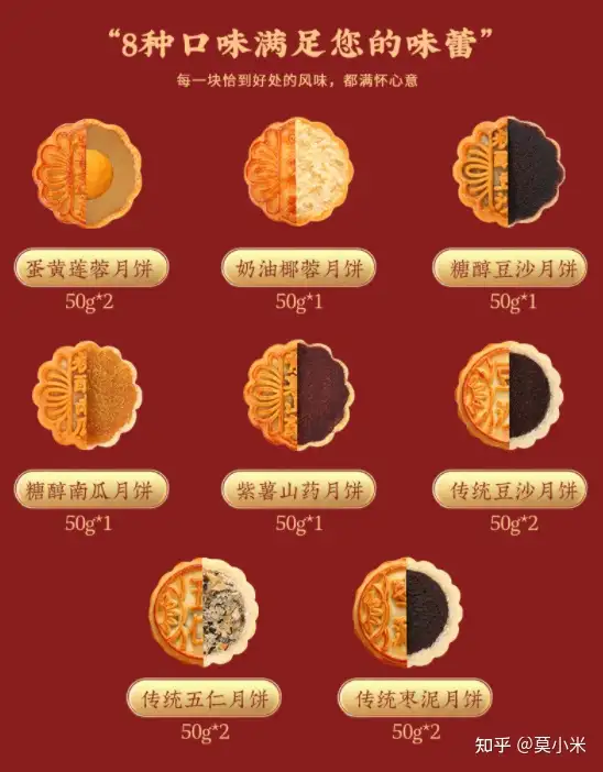 蛋黄莲蓉50g*1,奶油椰蓉50g*1,糖醇豆沙50g*1,糖醇南瓜50g*1,传统五仁50g*1,传统枣泥50g*1,蛋月烧五仁50g*1,蛋月烧香椰提子50g*1。
